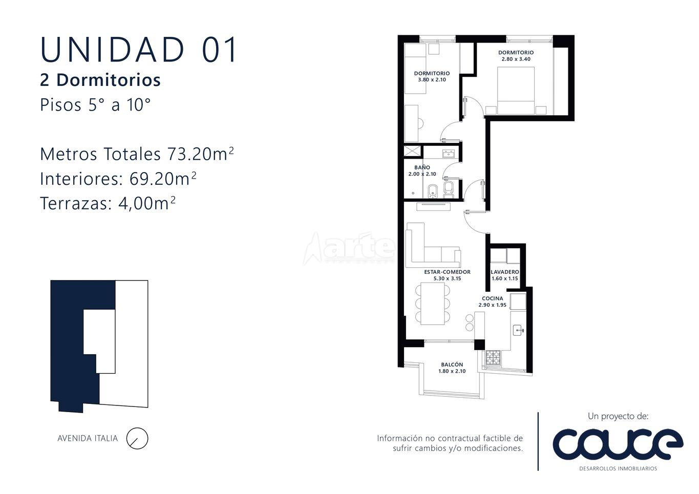 Amplio apartamento pronto para entregar al frente con muy buena orientación Norte sobre Av. Italia.Cómodo living comedor al frente con linda terraza, cocina semi integrada con ventana al frente y muy buen lavadero. Dormitorios al contra frente permitiendo ventilación cruzada. Se entrega con muy buenos placares en ambos dormitorios y previsión para colocar Aire Acondicionado en todos los ambientes.