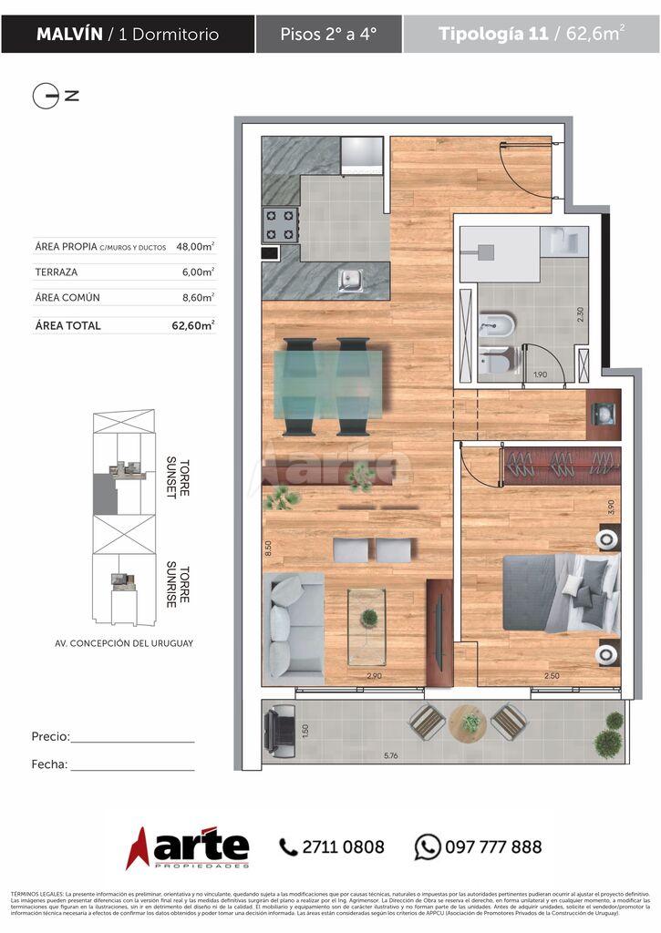 Divino apartamento de un dormitorio con muy linda terraza en la mejor zona de Malvín. Living y dormitorio con salida a la terraza y cocina integrada con amplia mesada y barra divisora, equipada con horno, anafe y campana. En un moderno edificio, sobre Concepción del Uruguay, que se estrena en invierno de 2025 y contará con gimnasio, lavadero, área de cowork y parrilleros de uso común.Características de la propiedad