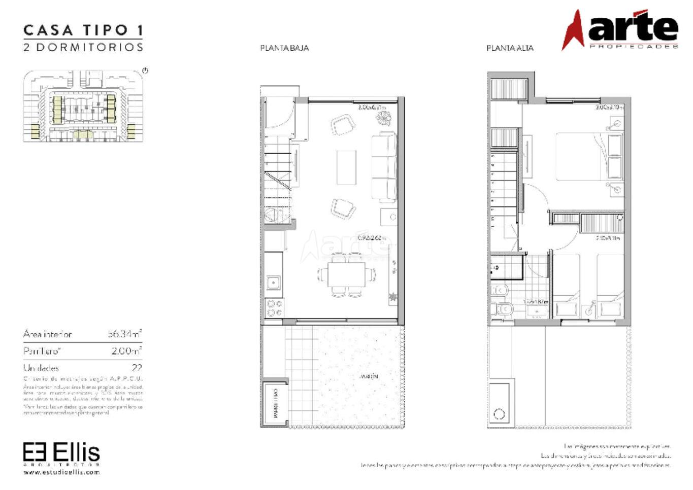 Lindas casas dúplex en un complejo cercado con seguridad. En planta baja se encuentra el living comedor con cocina integrada y patio con parrillero. En la planta alta se sitúan los 2 dormitorios uno con placard y el otro con vestidor y el baño completo con luz y ventilación natural.Las cocina se entregan equipadas con horno, anafe y campana, previsión para estufa de alto rendimiento y preinstalación de aire acondicionado.