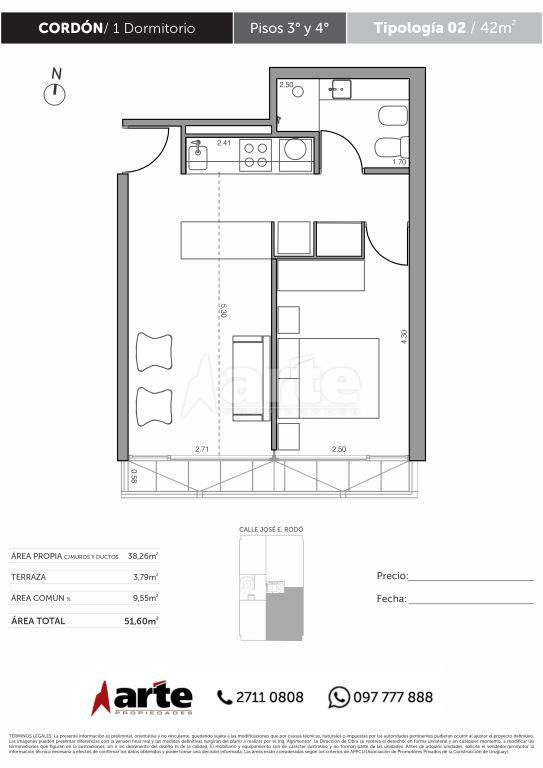 Lindo apartamento de un dormitorio en el Cordón, próximo a Br ArtigasEnormes ventanales con DVH en living y dormitorio, salida a balcón de ambos ambientes, cocina integrada con placares sobre y bajo mesada que se entrega con anafe, horno empotrado y campana de extracción de humos.