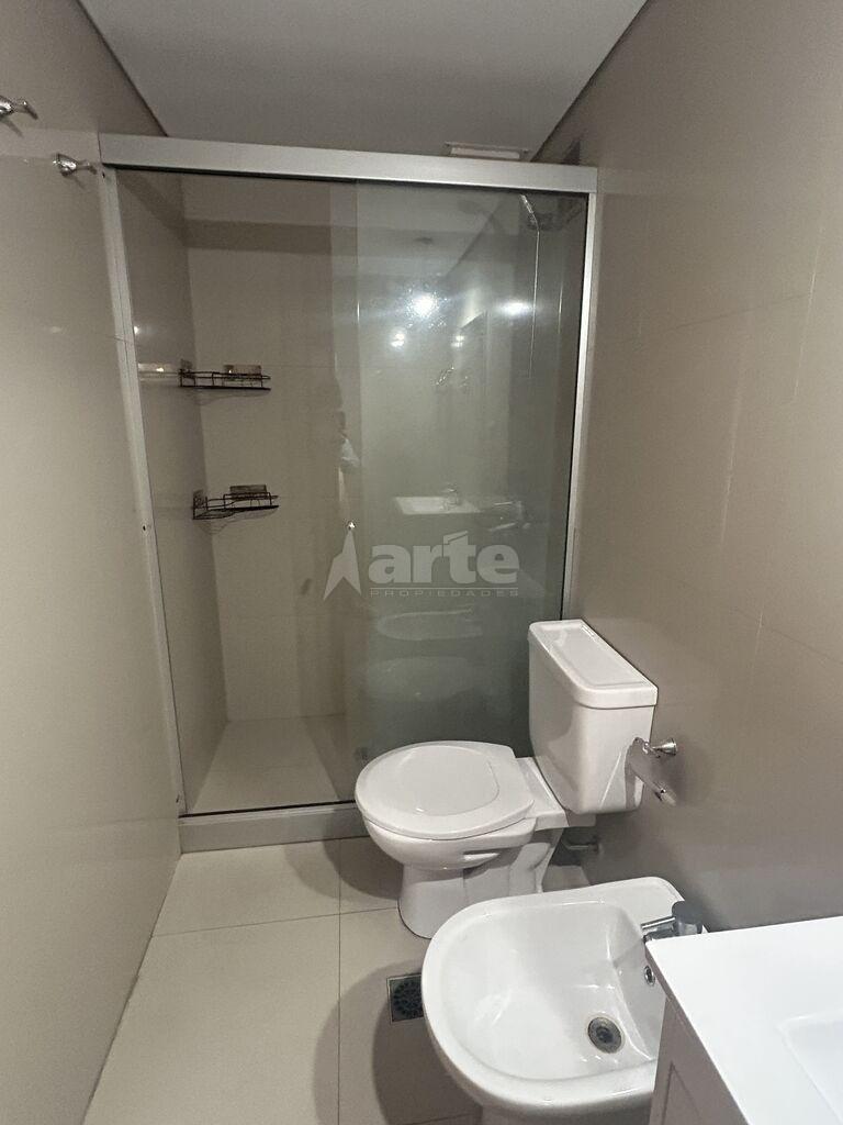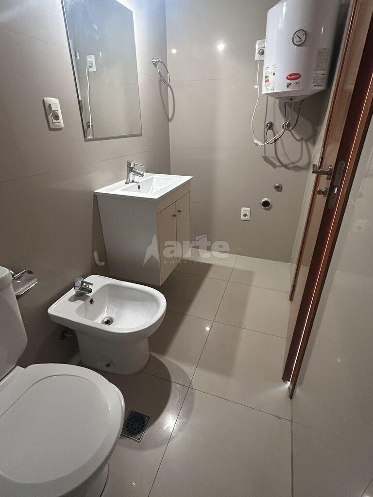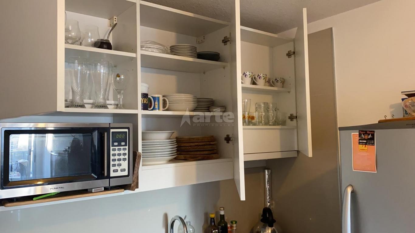 Cocina integrada y baño completo con mampara de vidrio, calefón instalado y conexión para lavarropas.