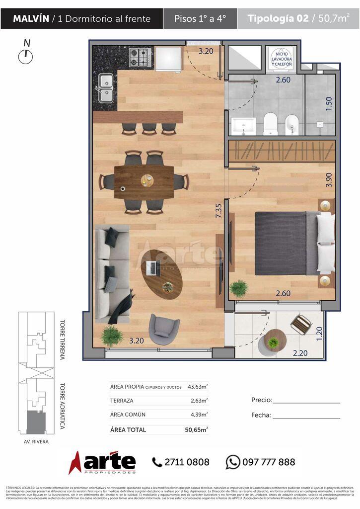 Proyecto muy bien ubicado en Malvin sobre la calle Rivera a la altura de Concepción del Uruguay.Excelente apartamento desarrollado todo al frente, living comedor con cocina integrada con mesada en L y barra, buen dormitorio con placard y baño completo con conexión para lavarropas.