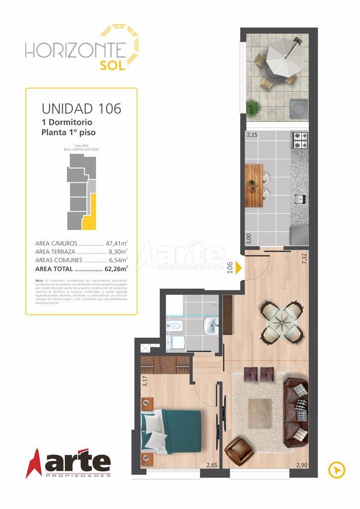 Divino apartamento contra frente orientado al Oeste. Amplio living comedor con el sol de la tarde, dormitorio con placard y única cocina definida con doble mesada y salida a un patio exclusivo. Calefacción con aire acondicionado ya instalados, aberturas DVH.